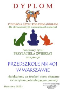Szanowni Państwo! Z przyjemnością informujemy, że za przekazane dary Fundacja Azylu pod Psim Aniołem uhonorowała nasze przedszkole tytułem PRZYJACIELA ZWIERZĄT. Serdecznie dziękujemy za bardzo aktywne włączenie się w pomoc bezdomnym zwierzętom 🙂