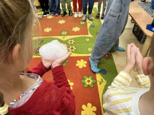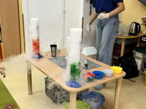 Na początku wszyscy byliśmy bardzo zaciekawieni. Pani wsypała suchy lód do miski z wodą i od razu zrobiła się wielka mgła. Wyglądało to, jakby w sali pojawiła się chmura. Mogliśmy ją dotykać i dmuchać w nią – była zimna i pachniała świeżością.