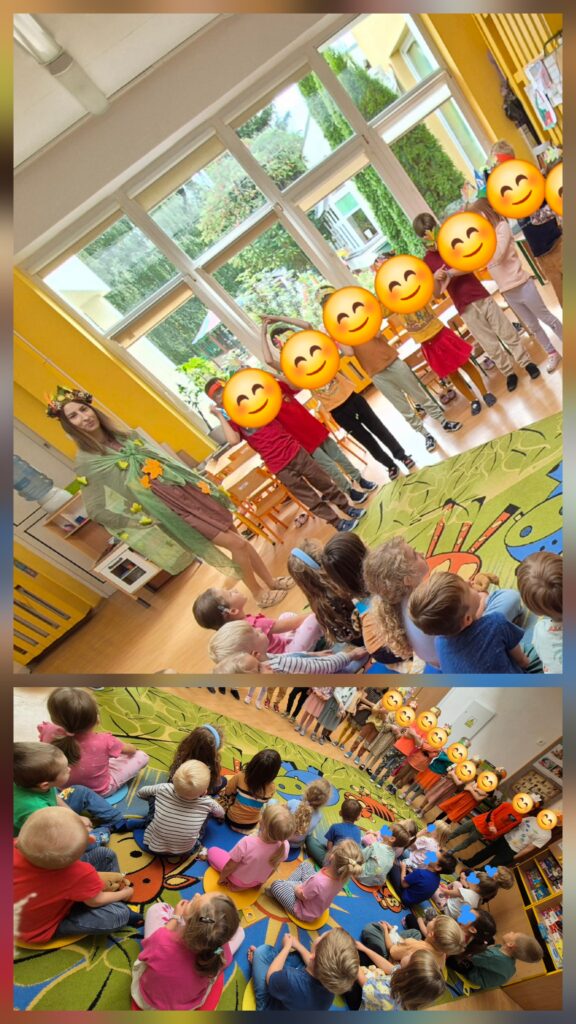 W pierwszy dzień kalendarzowej jesieni odwiedzili nas niezwykli goście – Pani Jesień razem ze swoimi pomocnikami. Pani Jesień opowiedziała nam o swojej „pracy” i zmianach w przyrodzie podczas jej pory roku, a towarzyszące jej dzieci zaśpiewały piosenkę o odpowiednim ubieraniu się podczas jesiennej aury. W podziękowaniu Kotki wręczyły gościni własnoręcznie stworzone „Portrety Pani Jesieni”.